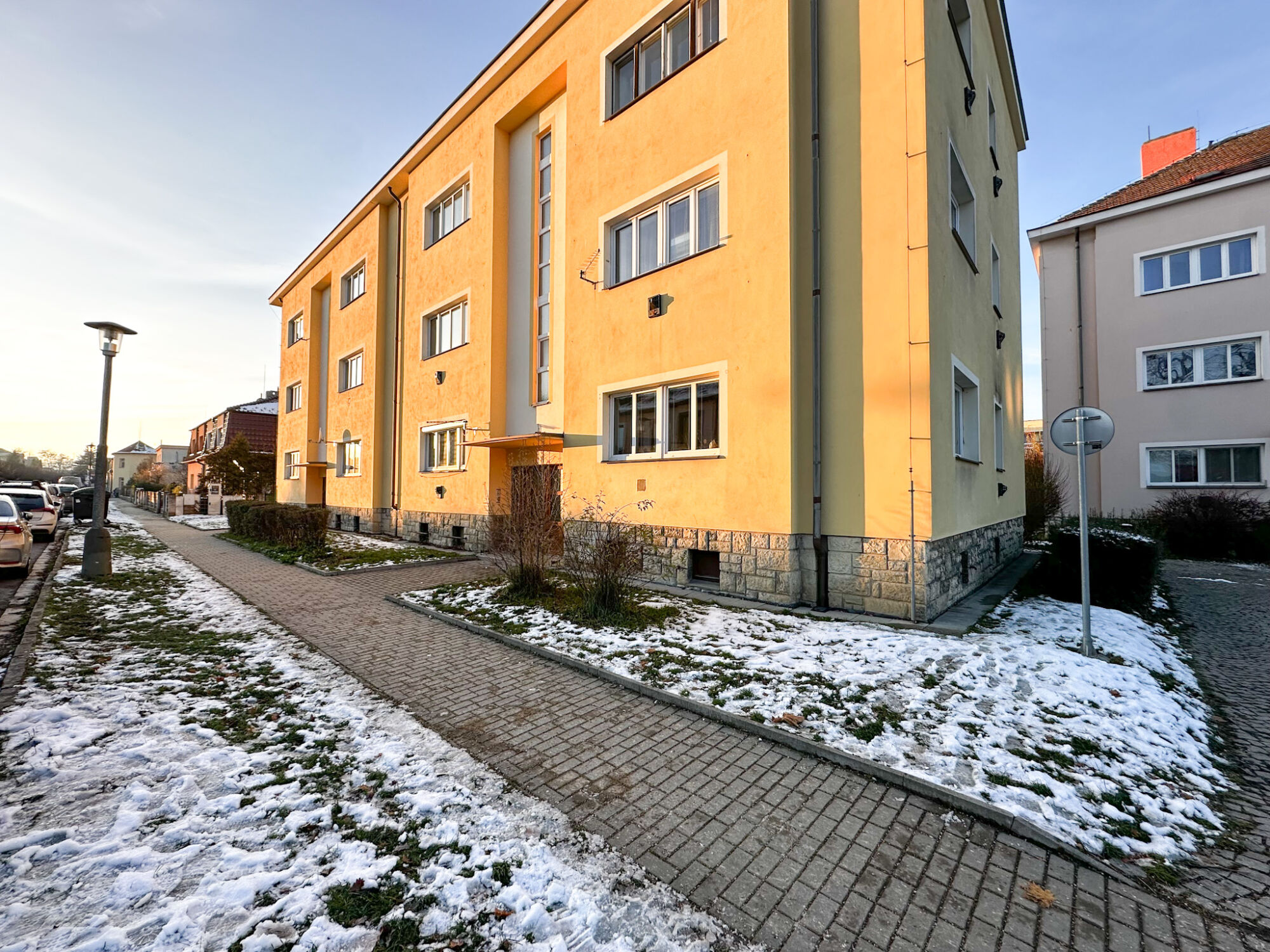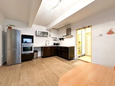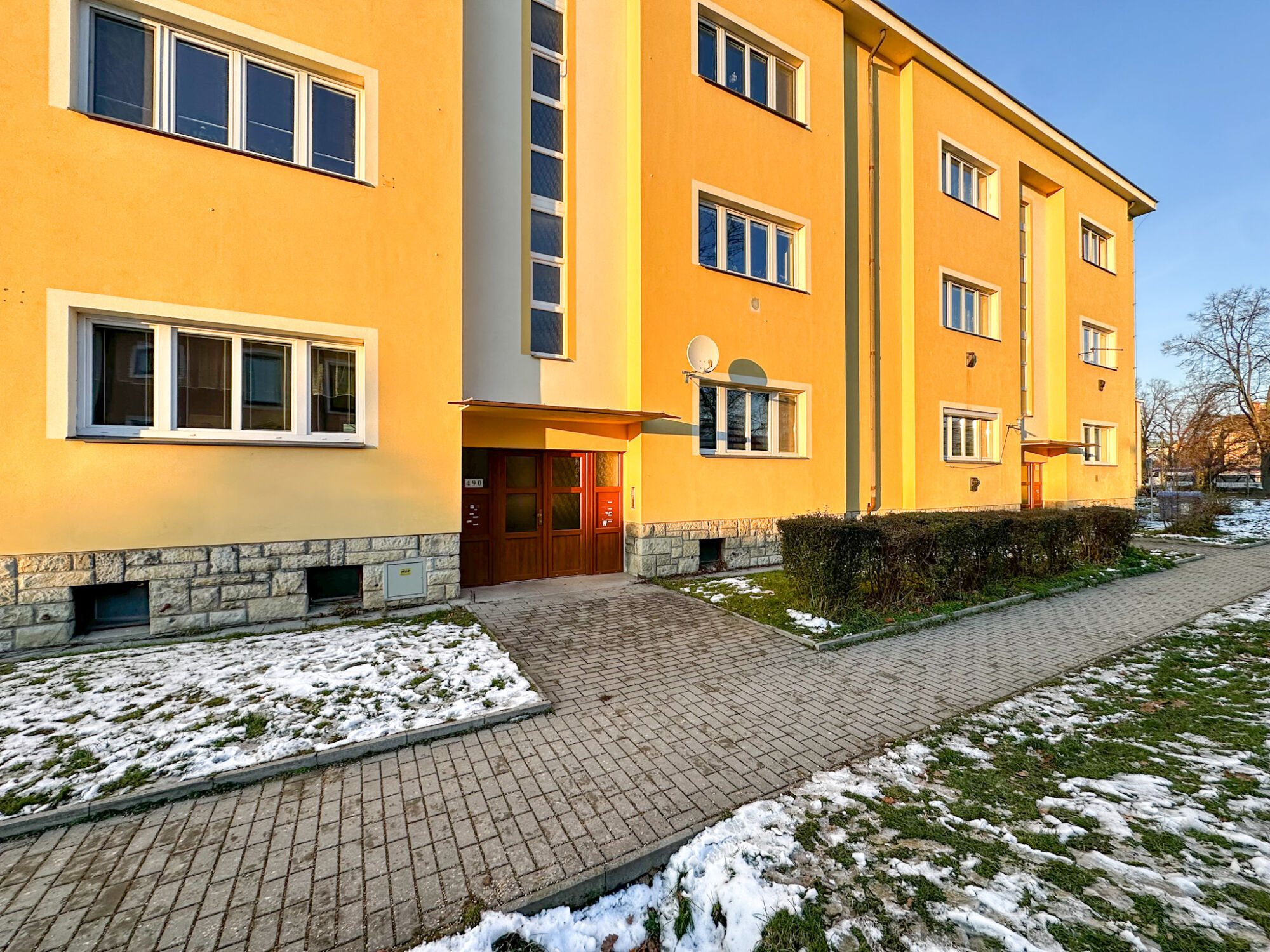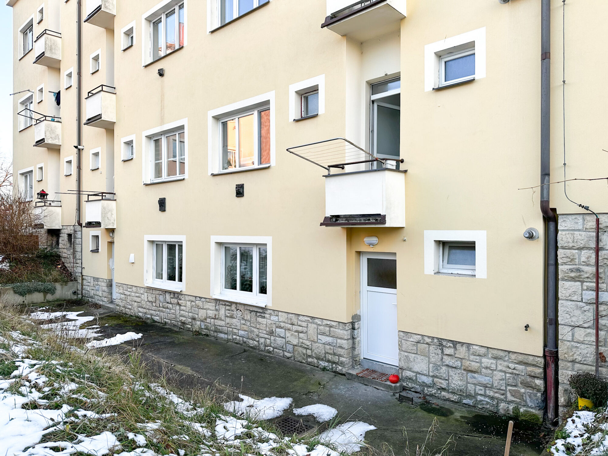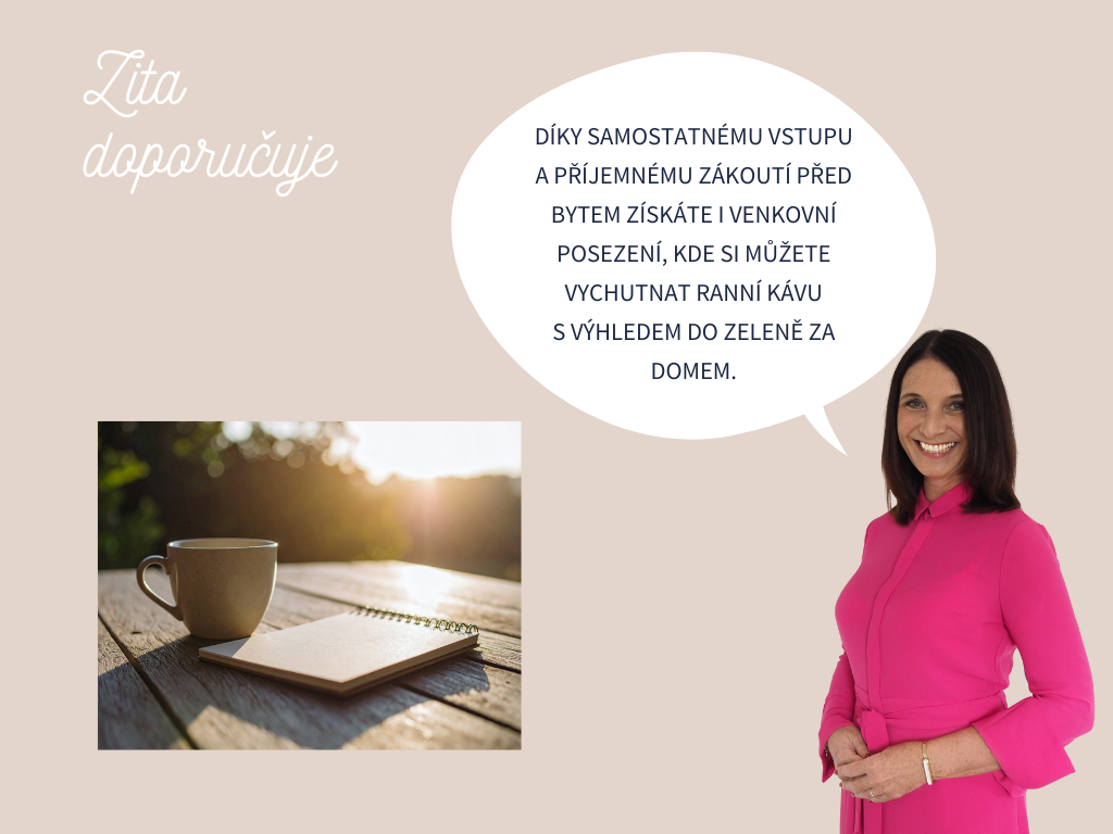 Přímo u vstupu se nachází zapuštěná terasa, kterou lze proměnit v útulné venkovní posezení – slunečník, stolek, bylinky v truhlících… Ideální místo na ranní kávu s výhledem do zeleně za domem. K bytu náleží sklepní kóje o výměře 5 m².